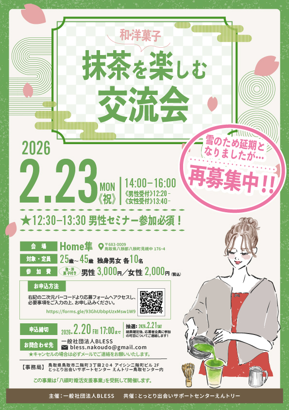 (一社)BLESS主催のイベントのお知らせです。 抹茶の香りに癒やされながら、自然体で交流できる婚活者向けの交流イベントです。 お問合せ・お申込み先 (八頭町結婚支援受託事業) |